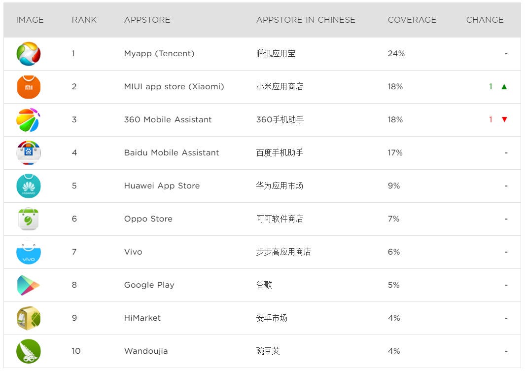 Unlike everywhere else in the world, Google Play only has a limited market share. They have only just recently launched into the market and have been slow to generate traction. Here are the top 10 stores from April 2016.